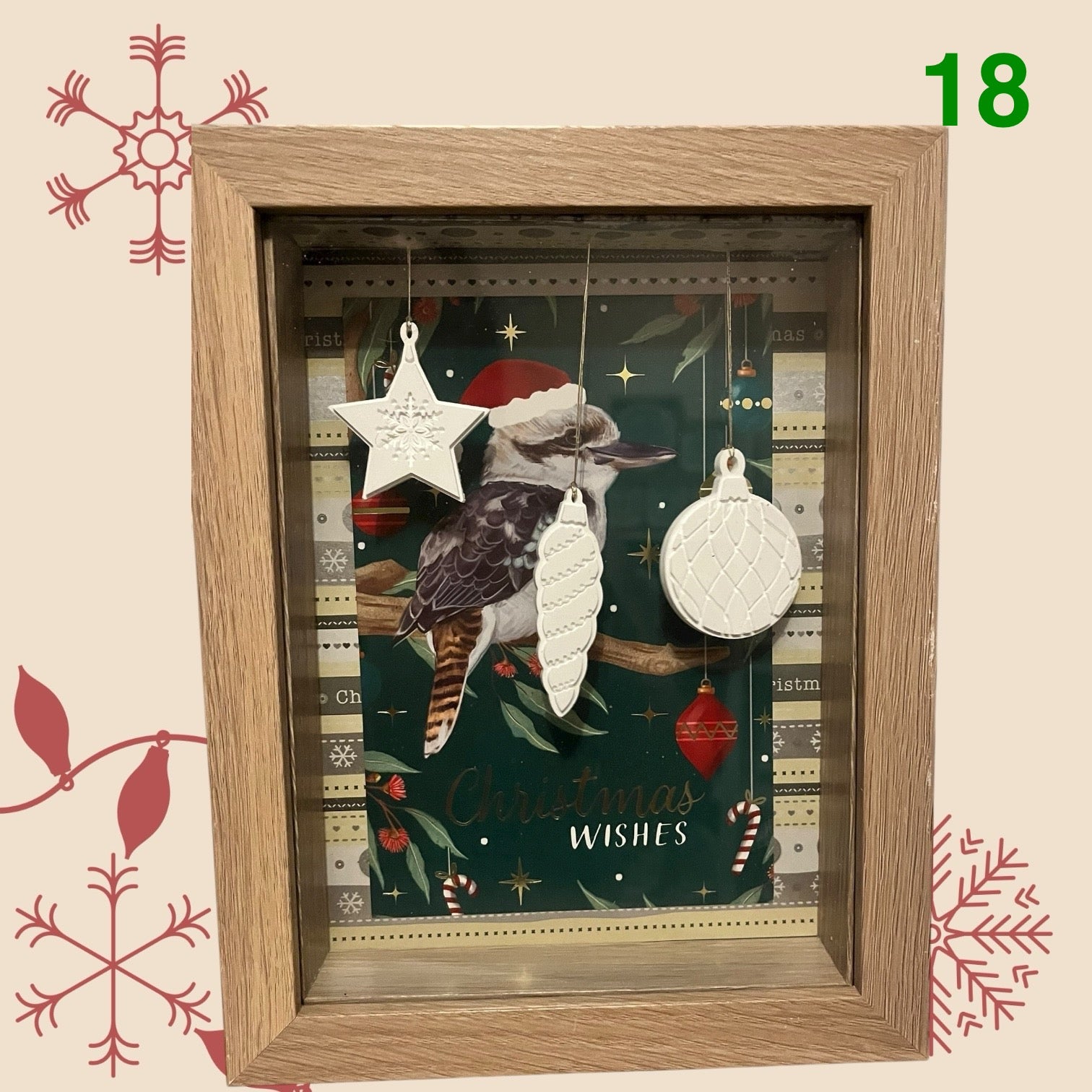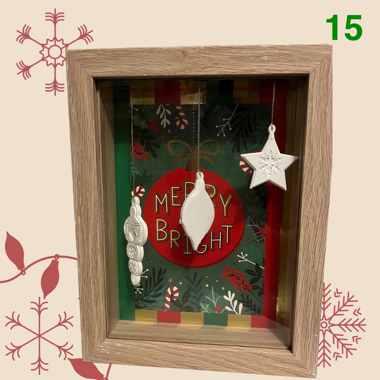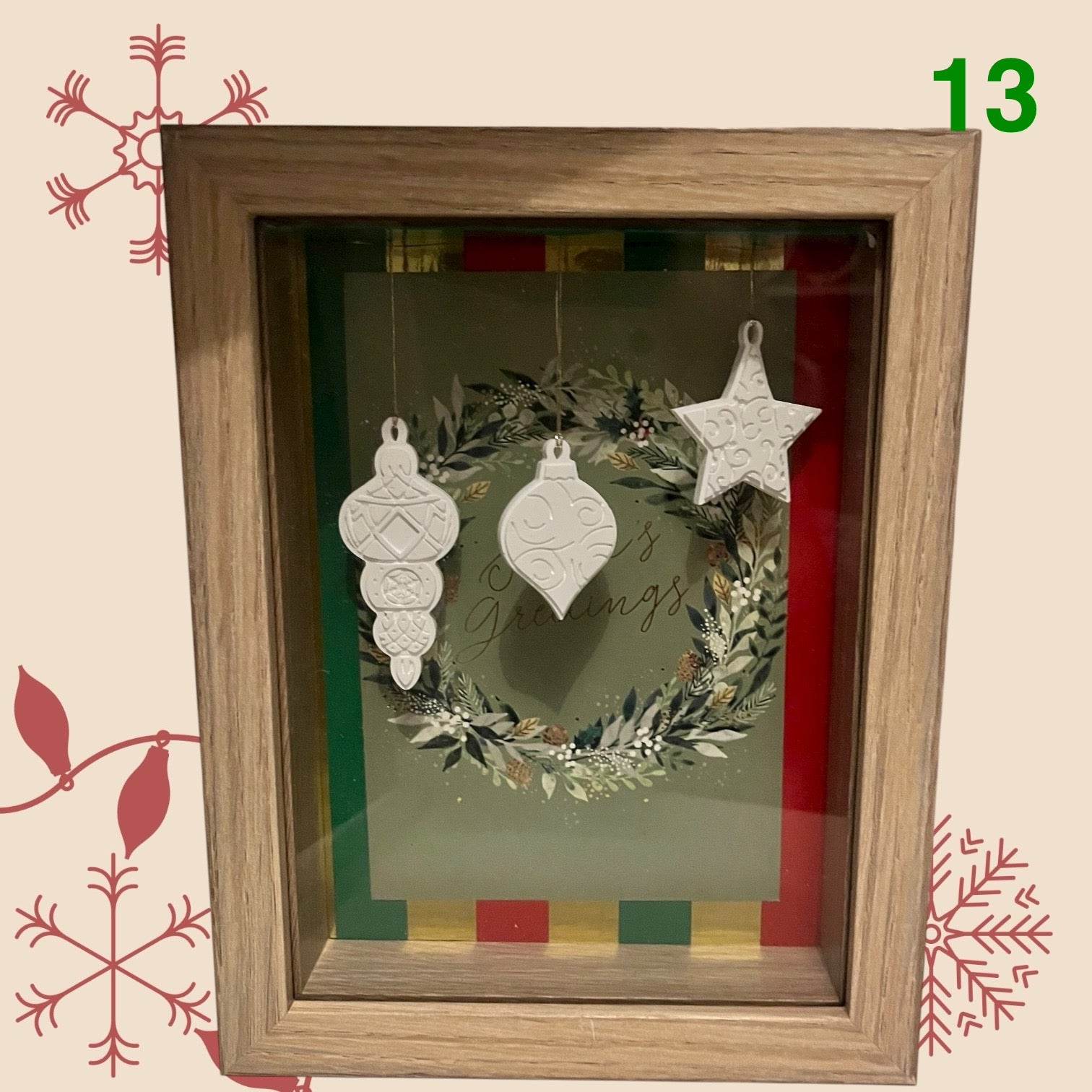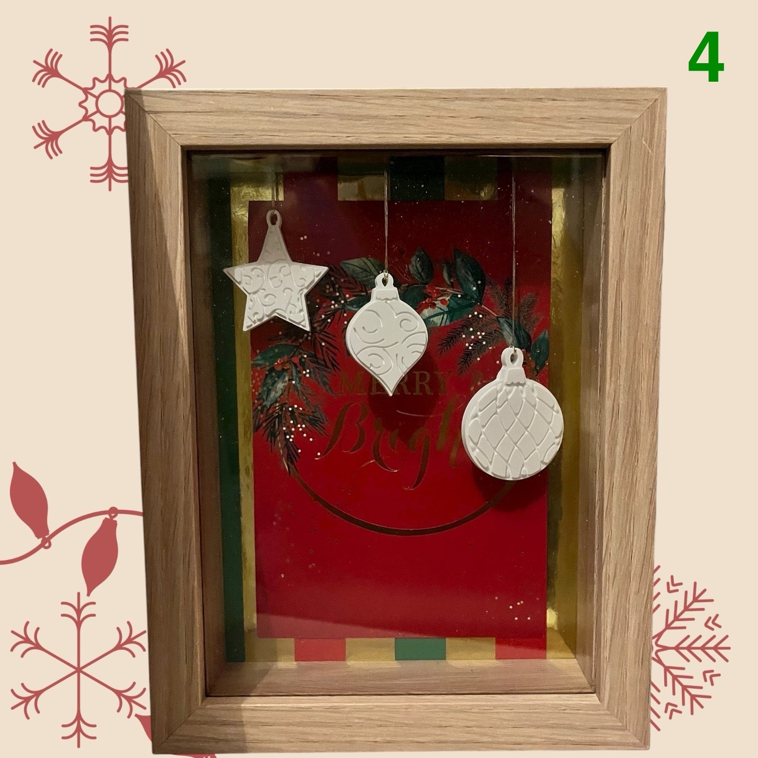 Hand poured ornaments with festive Christmas background in wooden shadowbox