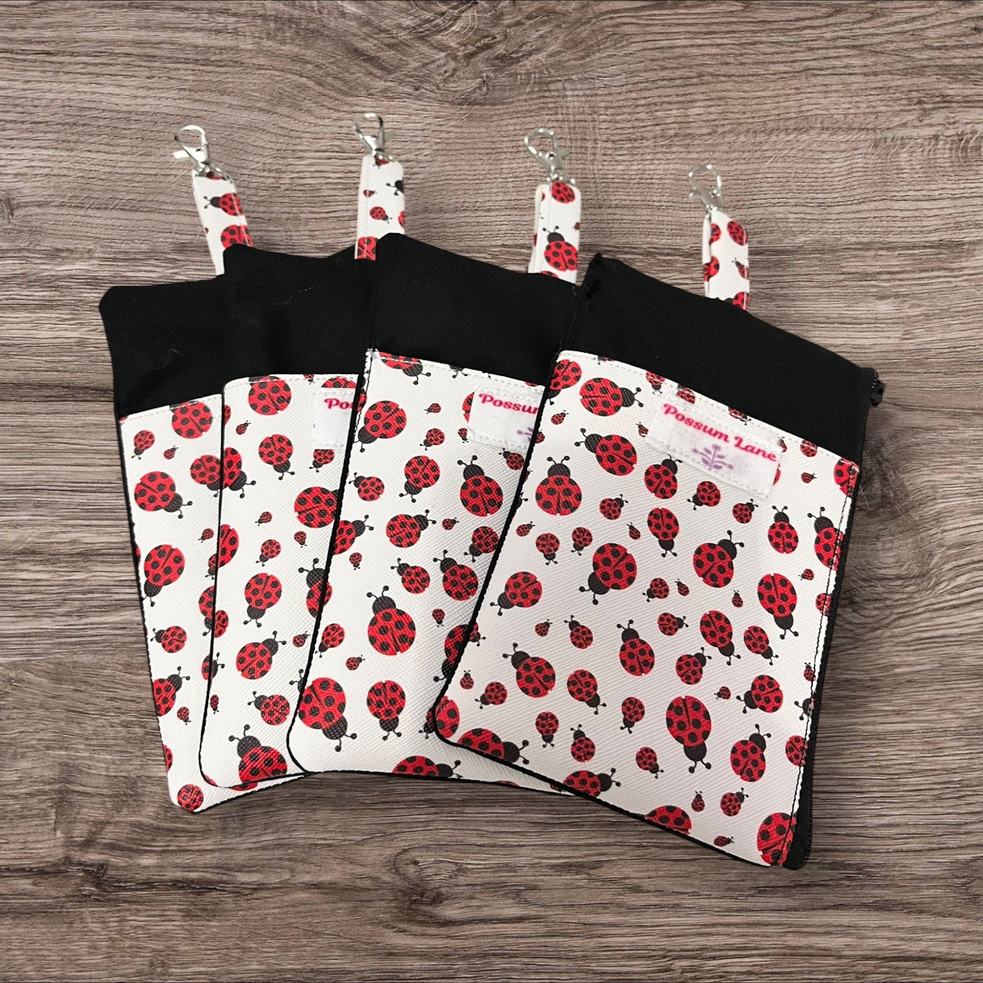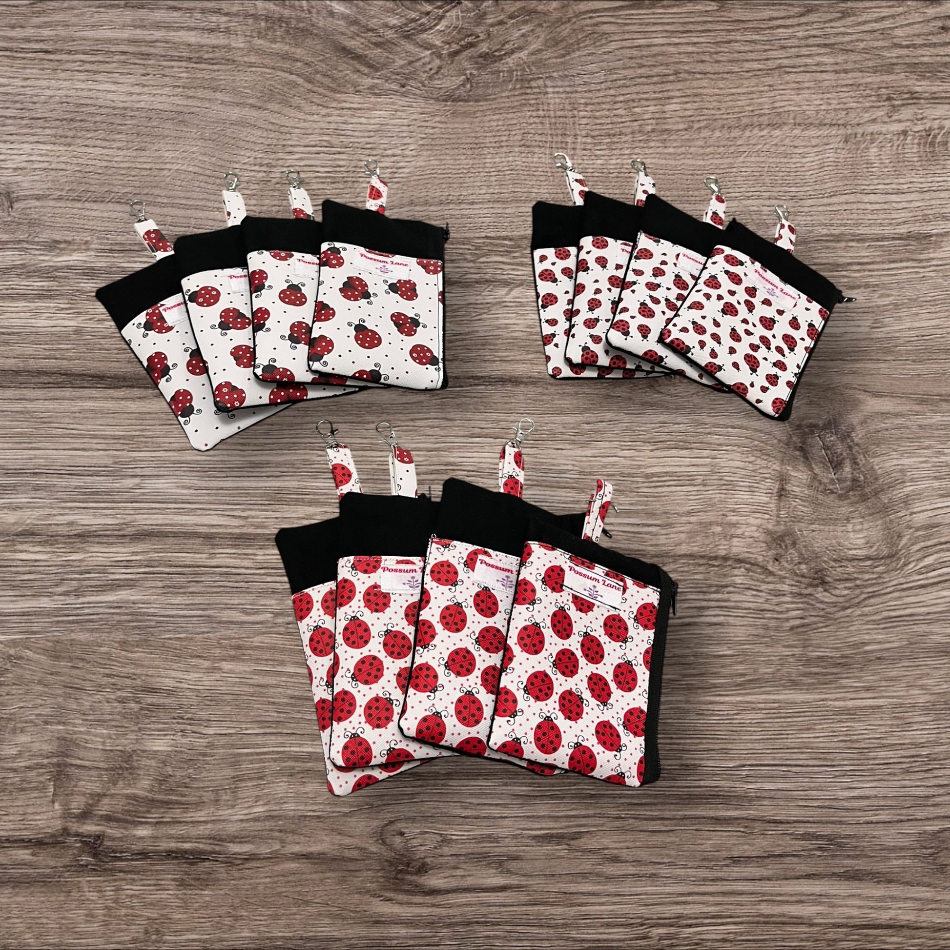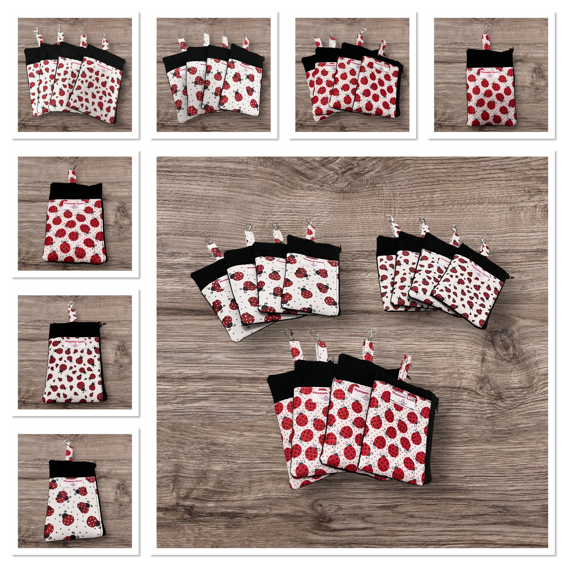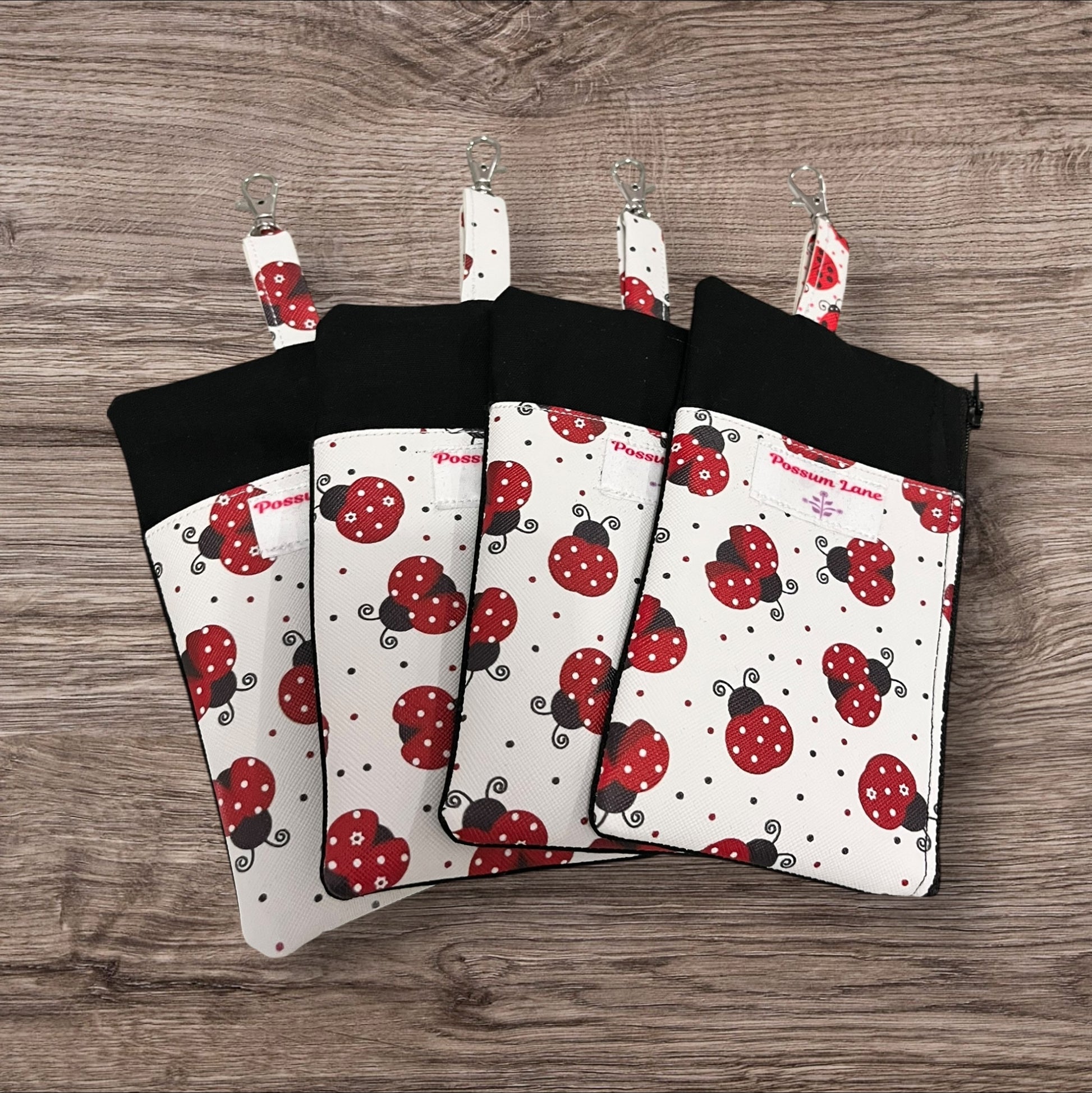 Hand sewn zip pouches with front pocket and bag clip made with love and care.